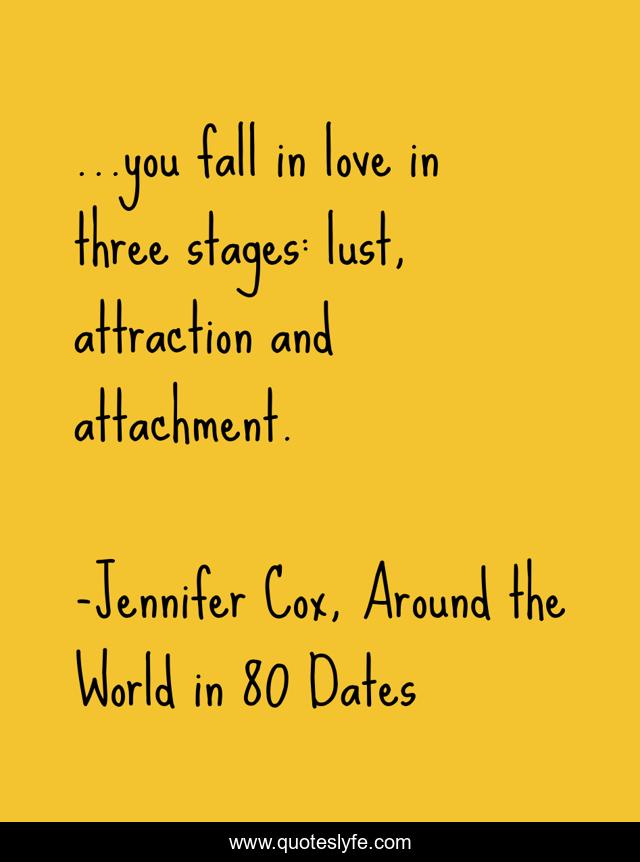 This page presents the quote "...you fall in love in three stages: lust, attraction and attachment.". Author of this quote is Jennifer Cox, Around the World in 80 Dates. .