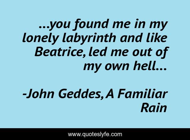 This page presents the quote "...you found me in my lonely labyrinth and like Beatrice, led me out of my own hell...". Author of this quote is John Geddes, A Familiar Rain. This quote is about labryrinth, love, beatrice, dante, hell, affection,.