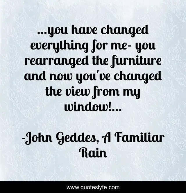This page presents the quote "...you have changed everything for me- you rearranged the furniture and now you've changed the view from my window!...". Author of this quote is John Geddes, A Familiar Rain. This quote is about change, devotion, perspective,.