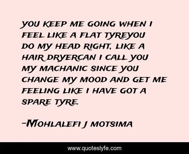 This page presents the quote "you keep me going when i feel like a flat tyreyou do my head right, like a hair dryercan i call you my machanic since you change my mood and get me feeling like i have got a spare tyre.". Author of this quote is Mohlalefi j motsima. This quote is about mood, compassion, machanic, sadness, appreciatite, comparism, happiness,.