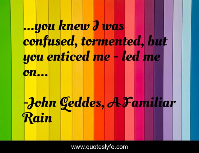 This page presents the quote "...you knew I was confused, tormented, but you enticed me - led me on...". Author of this quote is John Geddes, A Familiar Rain. This quote is about confusion, unrequited, torment, affection, love,.