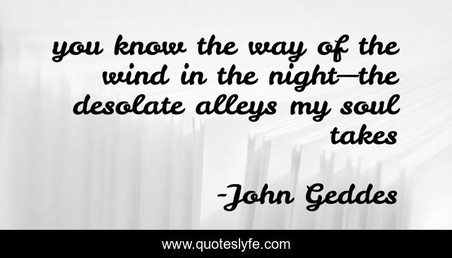 This page presents the quote "you know the way of the wind in the night—the desolate alleys my soul takes". Author of this quote is John Geddes. This quote is about need, desolation, solitude,.
