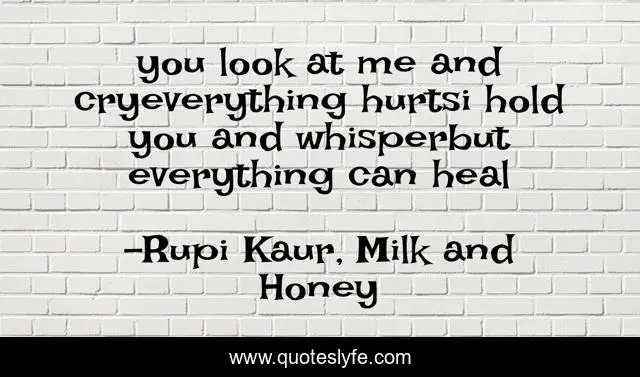 This page presents the quote "you look at me and cryeverything hurtsi hold you and whisperbut everything can heal". Author of this quote is Rupi Kaur, Milk and Honey. This quote is about mental-health, healing,.