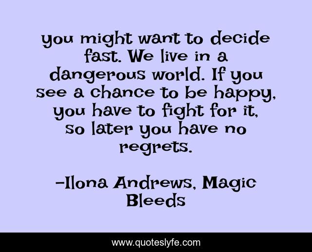 This page presents the quote "you might want to decide fast. We live in a dangerous world. If you see a chance to be happy, you have to fight for it, so later you have no regrets.". Author of this quote is Ilona Andrews, Magic Bleeds. This quote is about life, enjoy-life, enjoyment, joy, decision, fight, no-regrets, happy,.