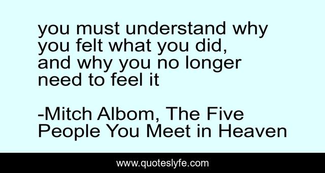 This page presents the quote "you must understand why you felt what you did, and why you no longer need to feel it". Author of this quote is Mitch Albom, The Five People You Meet in Heaven. .