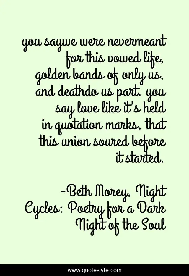 This page presents the quote "you saywe were nevermeant for this vowed life, golden bands of only us, and deathdo us part. you say love like it's held in quotation marks, that this union soured before it started.". Author of this quote is Beth Morey, Night Cycles: Poetry for a Dark Night of the Soul. This quote is about relationships, love, divorce, marriage, man-and-woman, affection,.