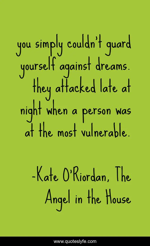 This page presents the quote "you simply couldn't guard yourself against dreams. they attacked late at night when a person was at the most vulnerable.". Author of this quote is Kate O'Riordan, The Angel in the House. This quote is about dreaming, guard, dreamers, vulnerability,.