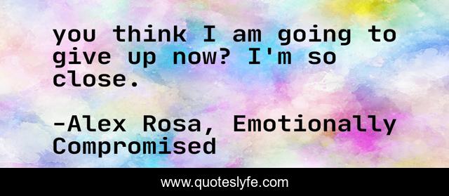 This page presents the quote "you think I am going to give up now? I'm so close.". Author of this quote is Alex Rosa, Emotionally Compromised. This quote is about true-love, love, goal, success, ambition, close, affection, emotionally-compromised,.