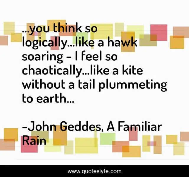 This page presents the quote "...you think so logically...like a hawk soaring - I feel so chaotically...like a kite without a tail plummeting to earth...". Author of this quote is John Geddes, A Familiar Rain. This quote is about strength, kite, out-of-control, emotional, fear, hawk,.