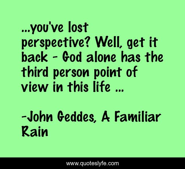 This page presents the quote "...you've lost perspective? Well, get it back - God alone has the third person point of view in this life ...". Author of this quote is John Geddes, A Familiar Rain. This quote is about god, perspective, point-of-view,.