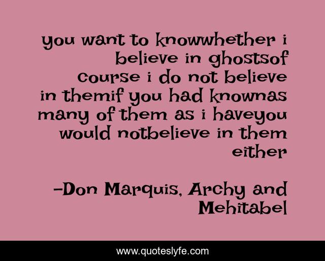 This page presents the quote "you want to knowwhether i believe in ghostsof course i do not believe in themif you had knownas many of them as i haveyou would notbelieve in them either". Author of this quote is Don Marquis, Archy and Mehitabel. This quote is about ghosts, trust, belief,.