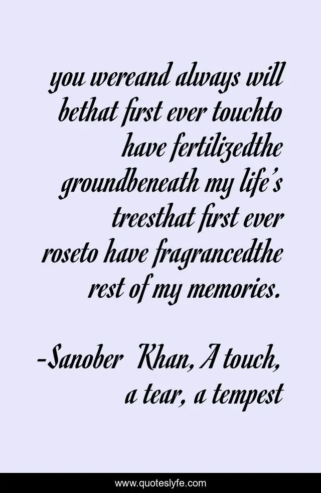 This page presents the quote "you wereand always will bethat first ever touchto have fertilizedthe groundbeneath my life’s treesthat first ever roseto have fragrancedthe rest of my memories.". Author of this quote is Sanober Khan, A touch, a tear, a tempest. This quote is about life, love, mothers, memories, indian-authors, poetry, trees, roses, fragrance,.