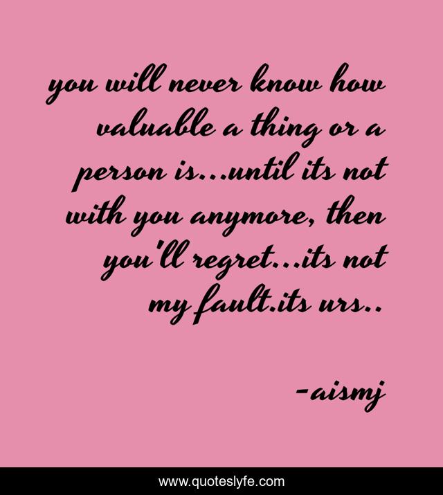 This page presents the quote "you will never know how valuable a thing or a person is...until its not with you anymore, then you'll regret...its not my fault.its urs..". Author of this quote is aismj. This quote is about heartbroken, trust,.