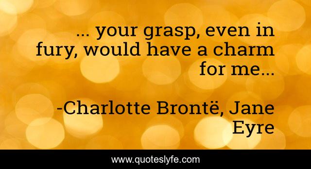 This page presents the quote "... your grasp, even in fury, would have a charm for me...". Author of this quote is Charlotte Brontë, Jane Eyre. This quote is about fury, love, madness, devotion, affection,.